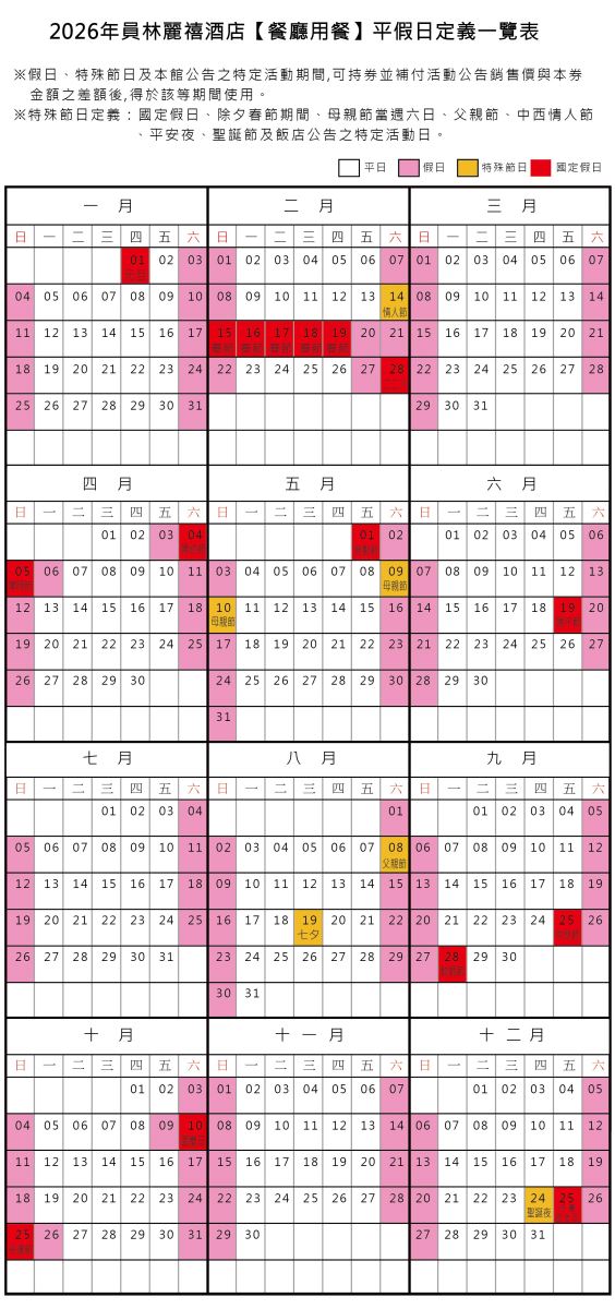 員林麗禧酒店【餐廳用餐】平假日定義一覽表